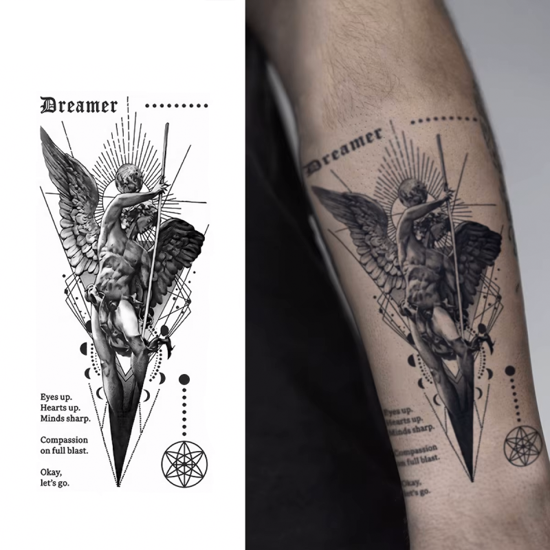 Representa a força de quem luta por seus ideais sem perder a sensibilidade. O anjo simboliza proteção e propósito; a palavra Dreamer lembra que até na guerra interior, o sonho continua sendo a arma mais poderosa.