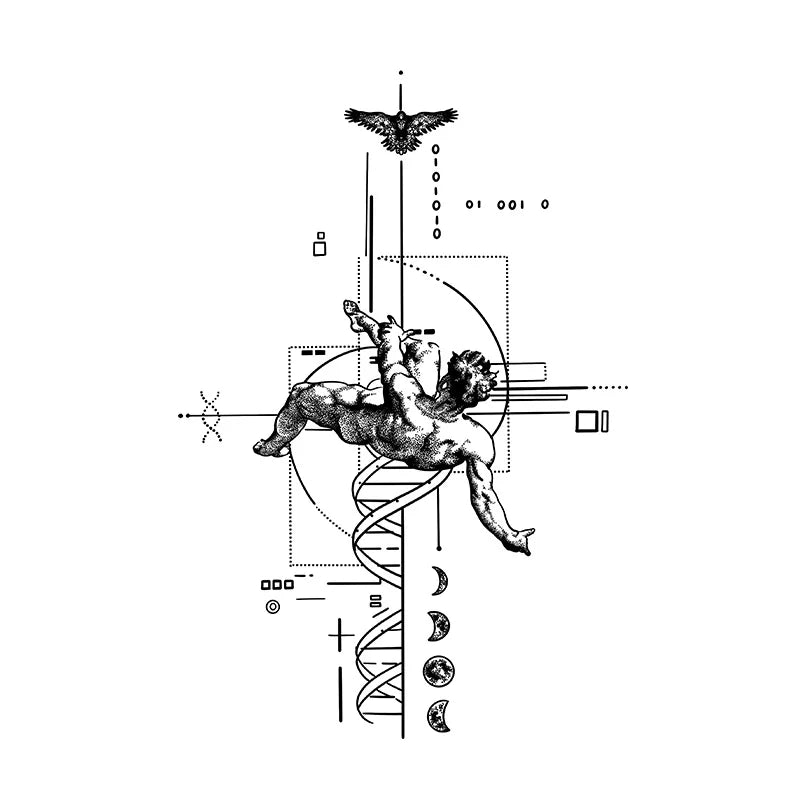 Entre o sagrado e o científico, essa tatuagem une anjo, espiral genética e fases da lua.