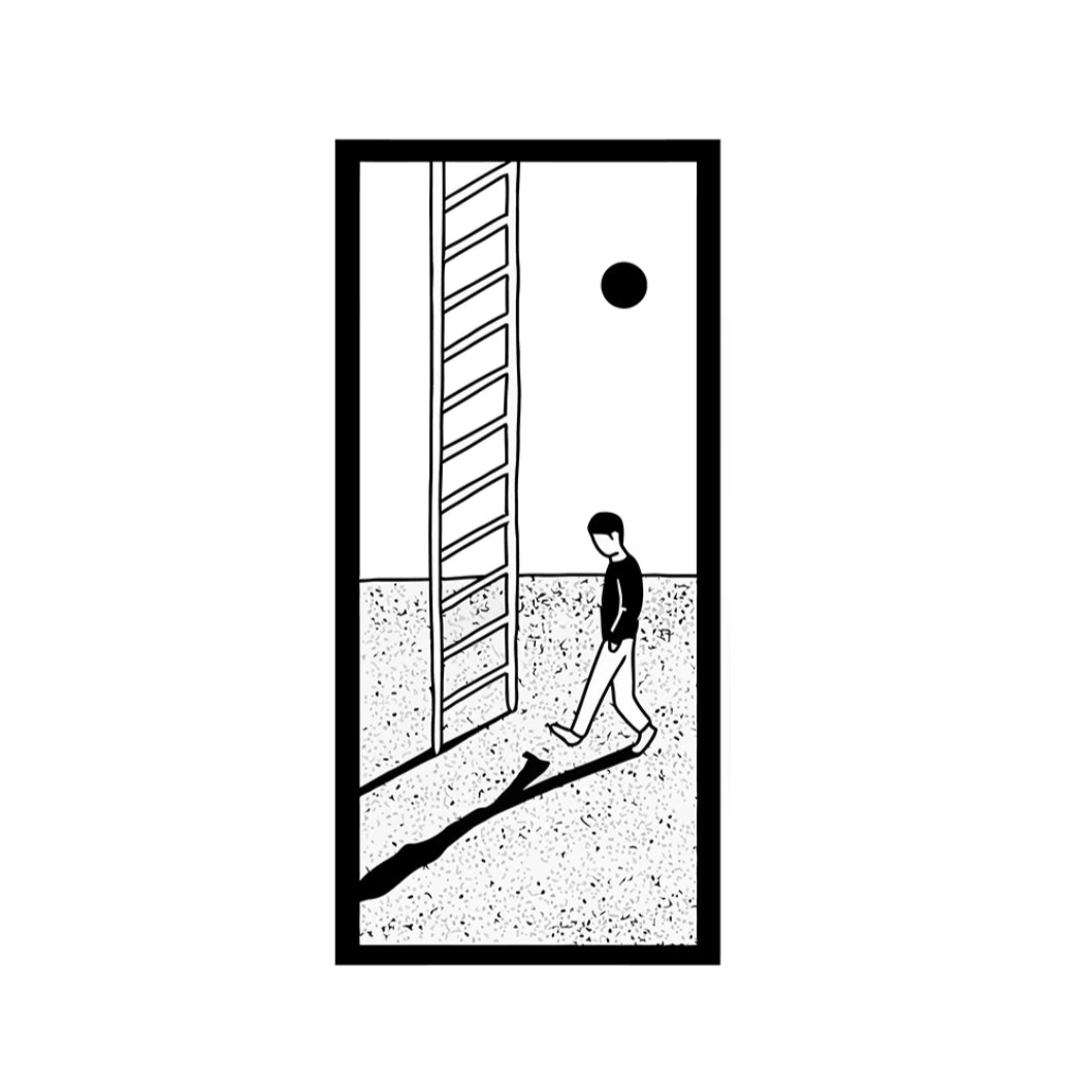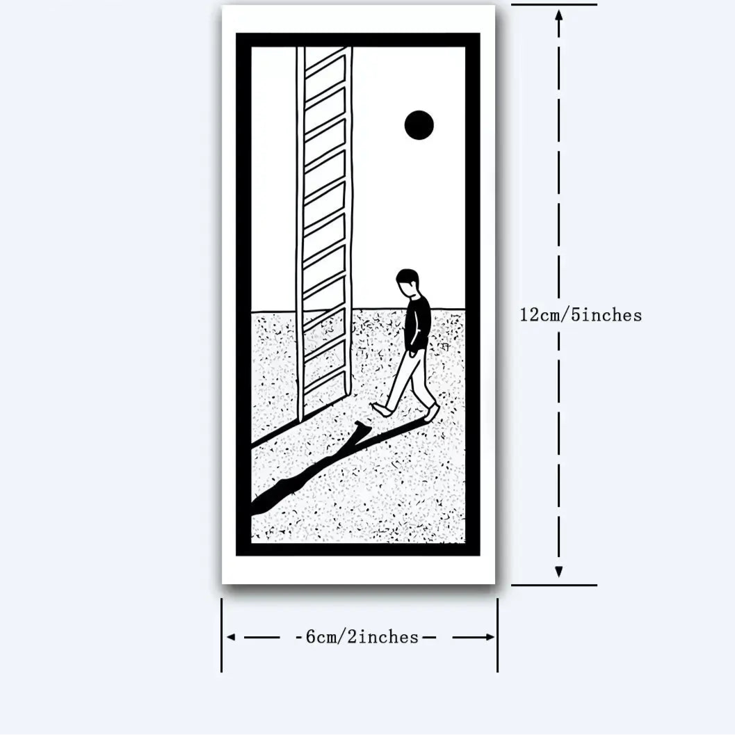 Com traços minimalistas, essa tatuagem nos traz uma imagem intrigante: uma pessoa em um deserto com uma escada em sua frente. Com certeza, nos faz refletir e pode gerar diversas interpretações sobre escolhas, solidão, ou até mesmo nos fazer questionar, para onde estamos indo?